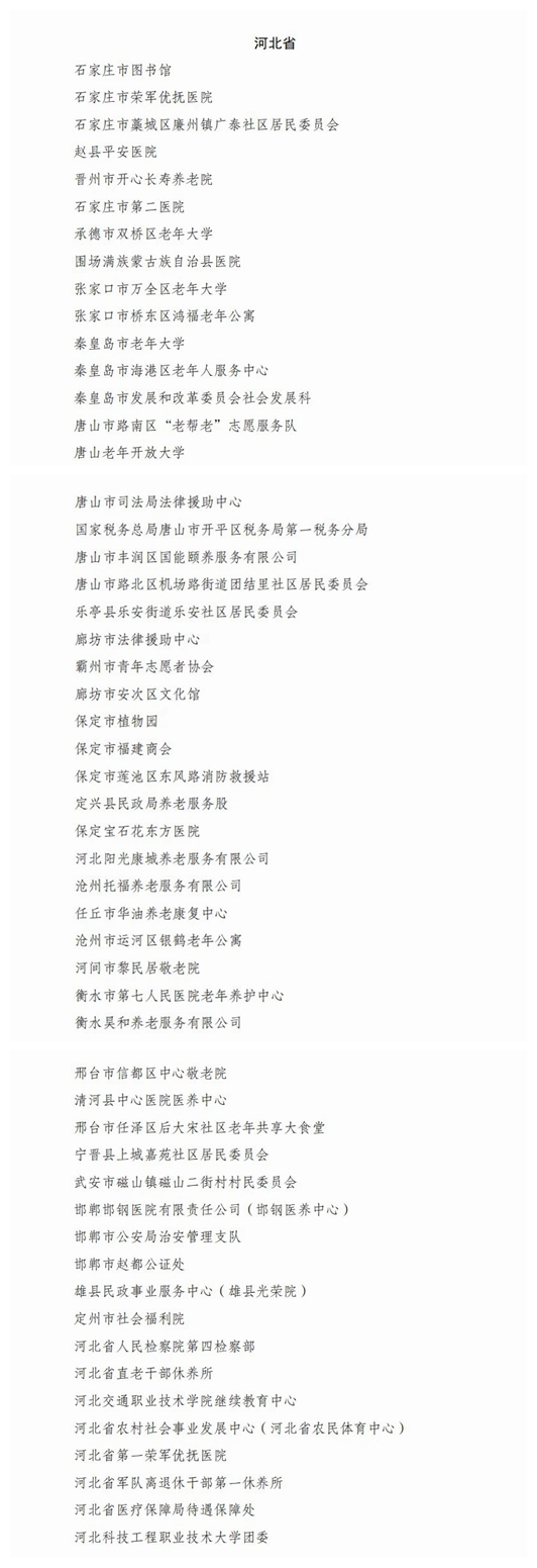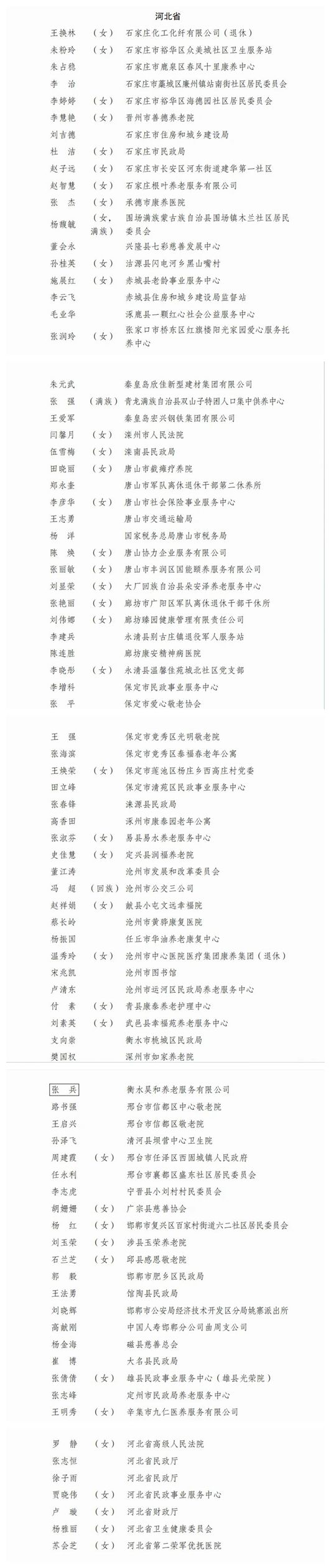 长城网·冀云客户端讯(记者 王棋)近日,全国老龄工作委员会办公室发布了《关于表彰全国“敬老文明号”和全国“敬老爱老助老模范人物”的决定》,授予1290个集体全国“敬老文明号”称号、1990名个人全国“敬老爱老助老模范人物”称号。其中,河北省有53个集体和85名个人上榜。