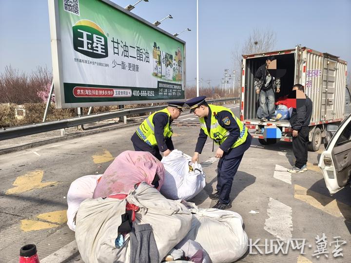 长城网·冀云客户端讯(通讯员 刘灵)3月25日10时许,一辆满载旧衣物的货车在下道时因急刹车,车上数十包已打包好的旧衣物瞬间散落一地。这不仅堵塞了车道,还对后方车辆的通行造成了影响。河北高速集团青银分公司宁晋收费站班长发现这一险情后,立刻上前查看情况。
