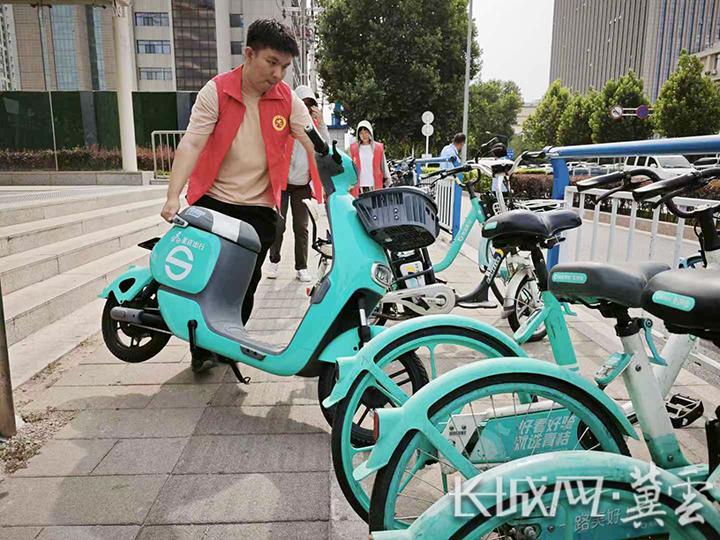 志愿者整理乱停放单车。