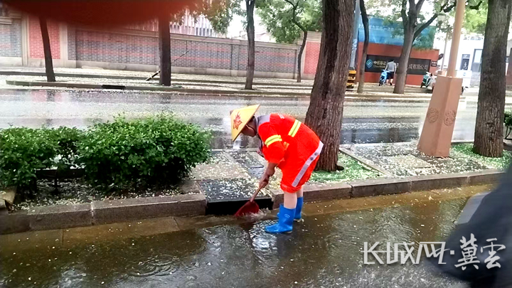 环卫工人在清理下水道口垃圾,加速雨水排放。石家庄市城管局供图