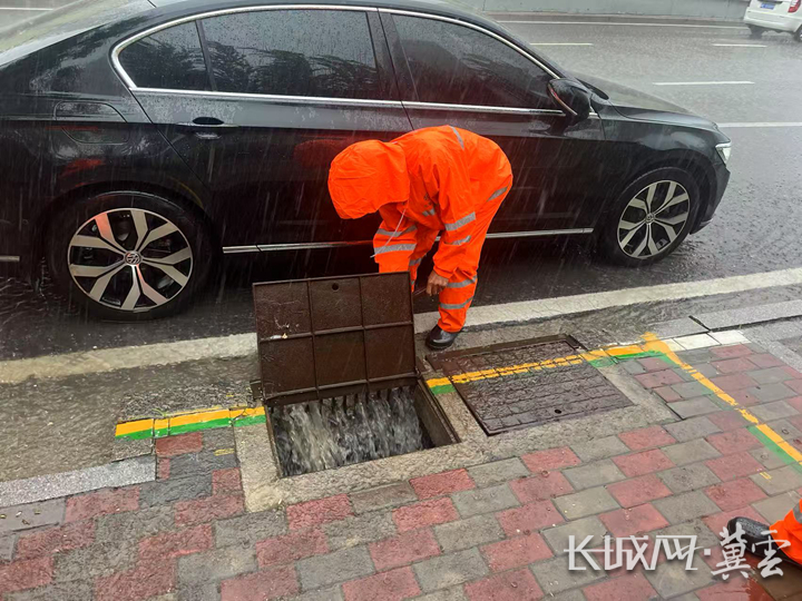 市排水管护中心备足防汛物资,出动965人开展雨中作业,及时打开雨水井盖,加快排水速度,并设置警示标志,安排专人值守,防止意外发生;在易积水路段、重点区域部署大型抽排设备23台,及时抽排积水;出动防汛巡查车153辆,动态巡查并迅速处置积水情况;同时,工作人员强化协同作战,冒雨疏导交通,提醒过往车辆和行人注意安全。