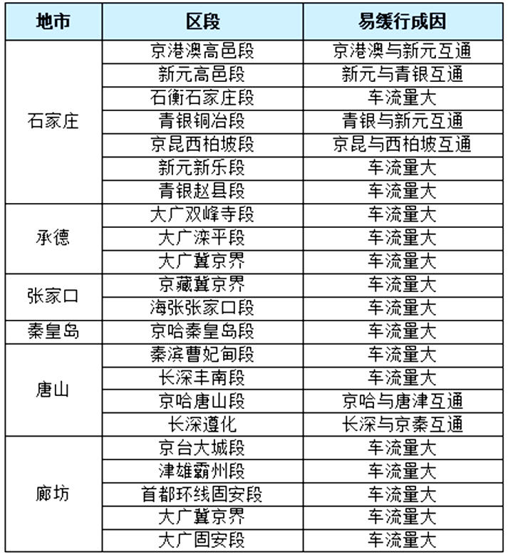 春运期间,全省高速公路易缓行点位主要集中在京港澳、京昆、青银、京沪、京台、大广等主干通道。其中,沧榆高速高阳段、青银高速赵县段、京藏高速冀京界、京港澳高速保定段、京昆高速西柏坡段、京雄高速冀京界、京沪高速青县段、大广高速衡水段、大广高速深州段9个路段为重点缓行区域,缓行成因多为道路互通车流交汇、车流量过大,部分路段还存在车道变窄的情况。各地市均有辖区易缓行区段,石家庄京港澳高邑段、新元高邑段等因互通导致通行压力大,承德、张家口、廊坊等环京津地市的冀京界、冀津界路段,因跨境车流集中成为缓行高发区。国省道大流量路段则分散在唐山、廊坊、邢台、承德、邯郸五市,唐山玉田102国道、廊坊三河102国道、邢台襄都107国道等路段需重点关注。
